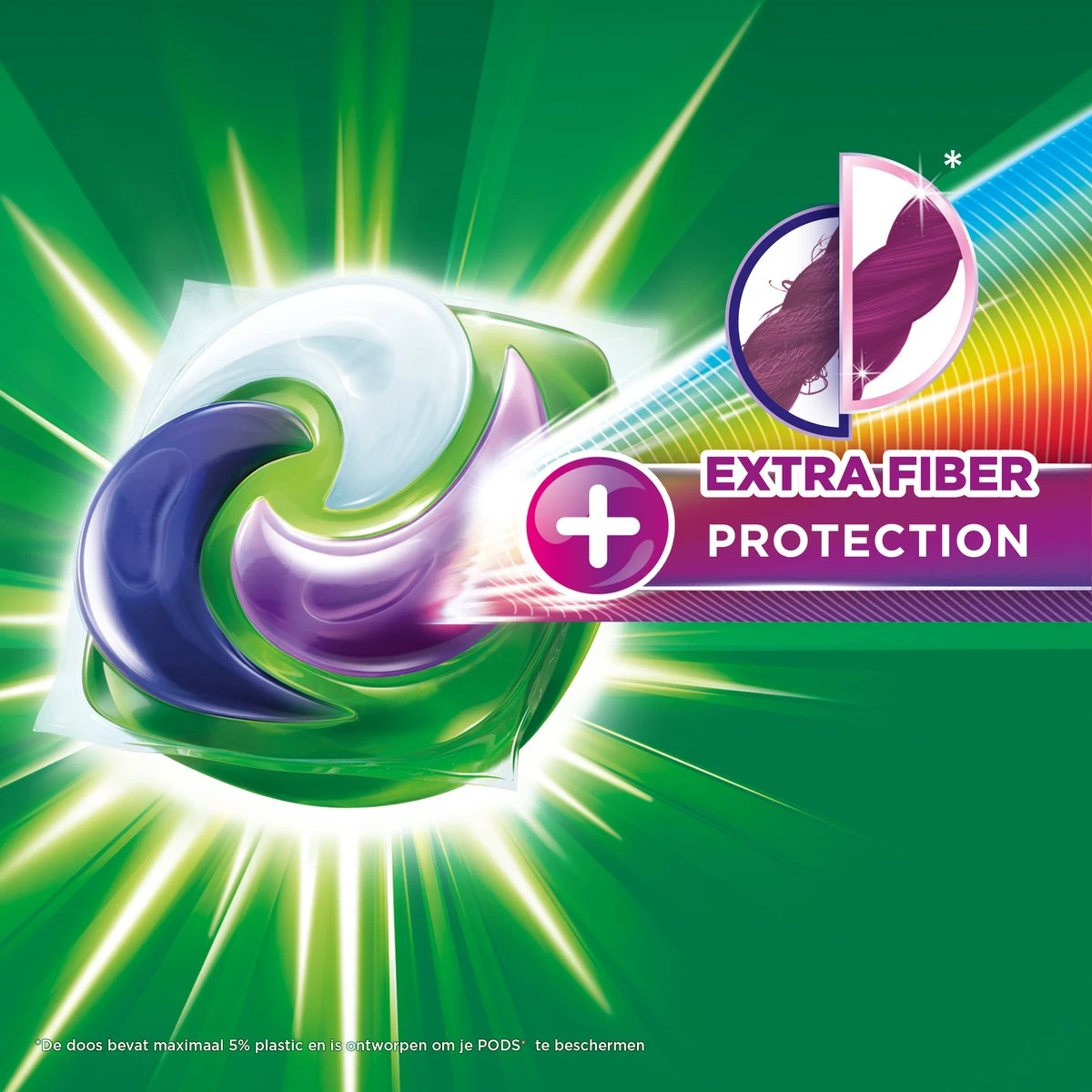 Onberispelijke reiniging + extra vezelbescherming: Ariel Wasmiddel Pods + Extra Vezelbescherming hebben nu een extra paars vak en vernieuwen de glans van kleuren terwijl de vezels beschermd worden